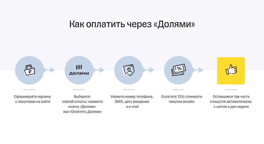 - Не в кредит и не в рассрочку. Оплата «Долями» — как обычная оплата картой: нет процентной ставки, кредитного договора и комиссий. Можно позволить себе больше и при этом не переплачивать.